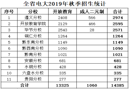10月13日下午,随着开放教育复审完成上报国家开放大学,2019年秋季招生全面结束,全季招生共14385人,与2018年秋季相比,增加了1031人,增幅为7.72%,超额完成招生任务,各分校具体招生人数如下: