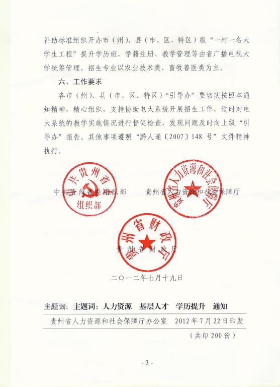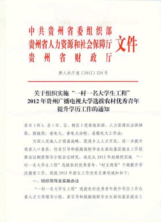 关于组织实施“一村一名大学生工程”2012年贵州广播电视大学选拔农村优秀青年提升学历工作的通知