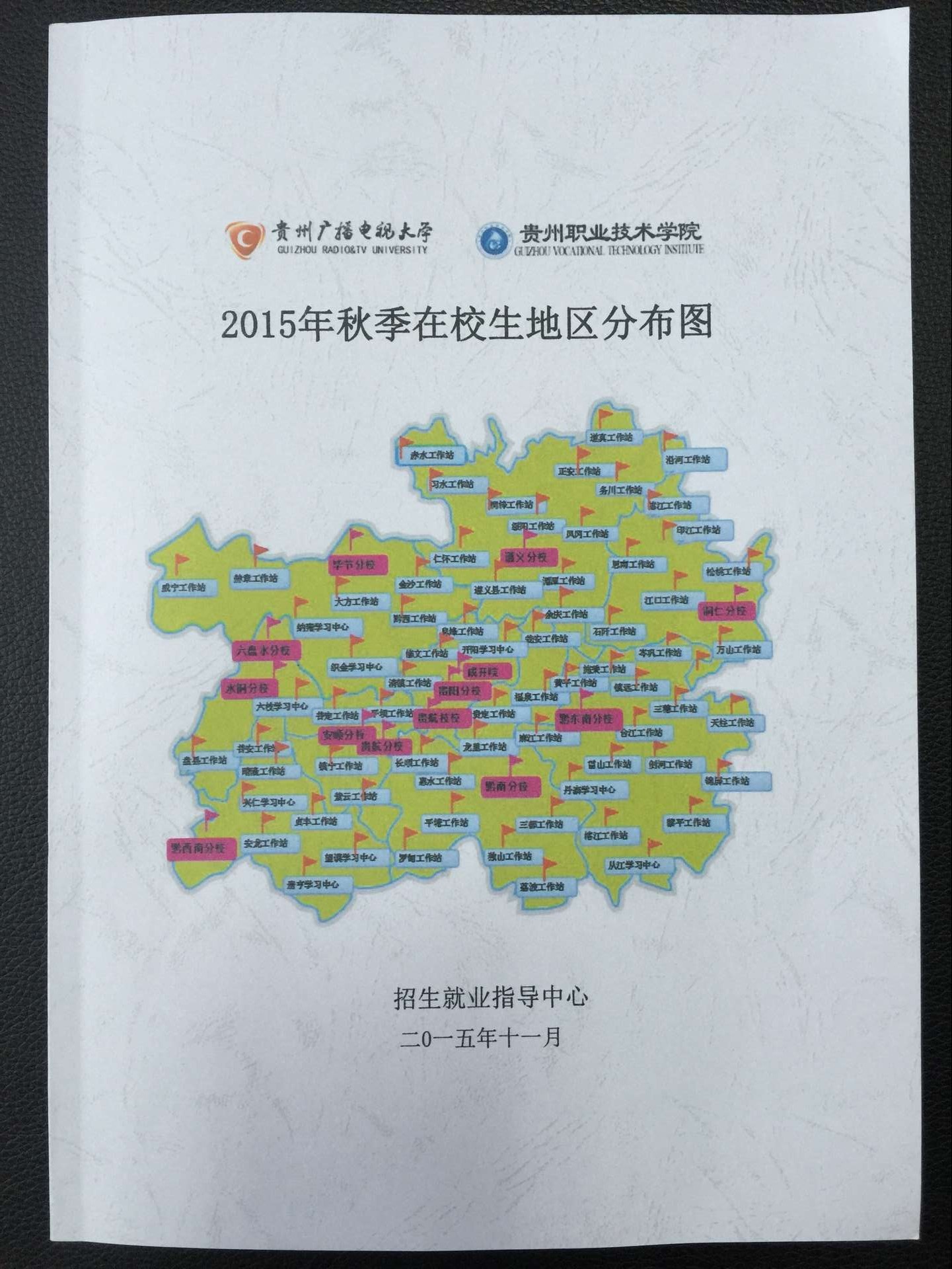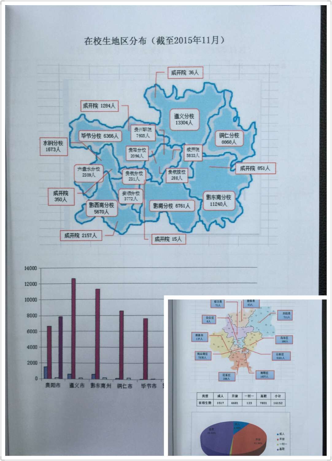 11月3日,我中心2015年秋季在校生地区分布图统计工作启动,经过近半月的绘制、排版,11月16日,分布图编制出炉。分布图采用图、表结合的方式,将全省电大和贵州职院2015年秋季在校生的地区分布及基本情况进行了图解,范围覆盖全省九个市州,类型涉及开放教育、成人大专及高职大专等三类。