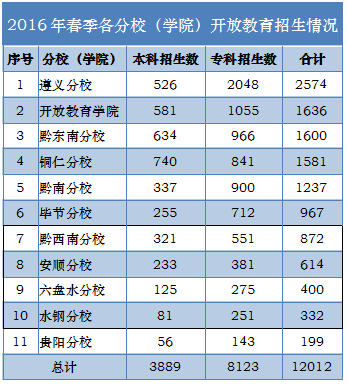 此次全省11所分校(学院)及所属工作站(学习中心)共78个单位参加了招生,其中一所分校招生规模在2000人以上,三所分校招生规模在1500-2000人之间,一所分校招生规模在1000-1500人之间。遵义分校、开放教育学院、黔东南分校位列招生绝对数前三甲。遵义分校、开放教育学院、铜仁分校、水钢分校等四所分校(学院)呈小幅增长。“一村一名大学生计划”和“新型产业工人培养和发展助力计划”两个项目在本季均未招收到新生。