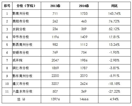 3月8日,2014年春季国家开放大学招生复审及数据上报工作顺利完成。全省复审通过并上报14666人,其中本科5166人,专科9124人,“一村一”376人。这次招生创下电大招生以来的春季历史新高,招生工作呈稳步攀升态势。在本季招生工作中,全省11所分校(学院)有10所超额完成任务,黔南分校和黔东南分校任务完成率超过了200%,单季招生即完成全年开放招生任务数,形势喜人。各单位完成任务情况如下: